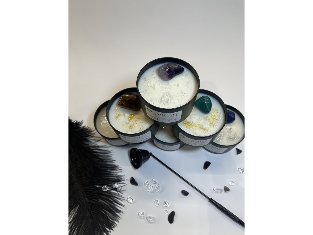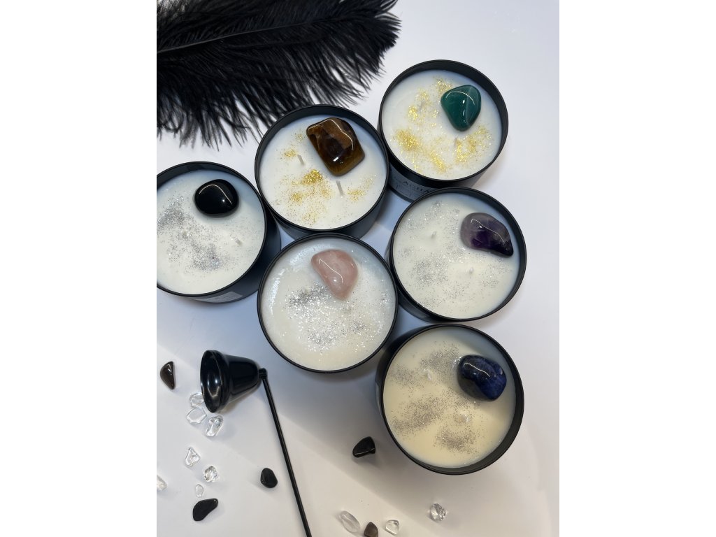 Elegantní minimalistická sójová svíčka v matné černé plechovce zdobená drahým kamenem, který dodá svíčce jedinečný vzhled a energetické kouzlo. Obsahuje přírodní esenciální oleje pro jemnou a harmonickou vůni a 2 bavlněné knoty pro déletrvající rovnoměrné hoření. Svíčka je šetrná k přírodě, bez parafínu a syntetických látek - ideální pro chvíle klidu a relaxace. Na výběr máte ze 6 druhů vonných svíček: