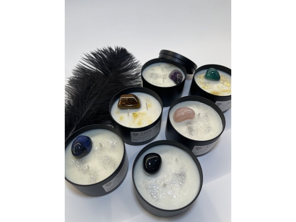Elegantní minimalistická sójová svíčka v matné černé plechovce zdobená drahým kamenem, který dodá svíčce jedinečný vzhled a energetické kouzlo. Obsahuje přírodní esenciální oleje pro jemnou a harmonickou vůni a 2 bavlněné knoty pro déletrvající rovnoměrné hoření. Svíčka je šetrná k přírodě, bez parafínu a syntetických látek - ideální pro chvíle klidu a relaxace. Na výběr máte ze 6 druhů vonných svíček: